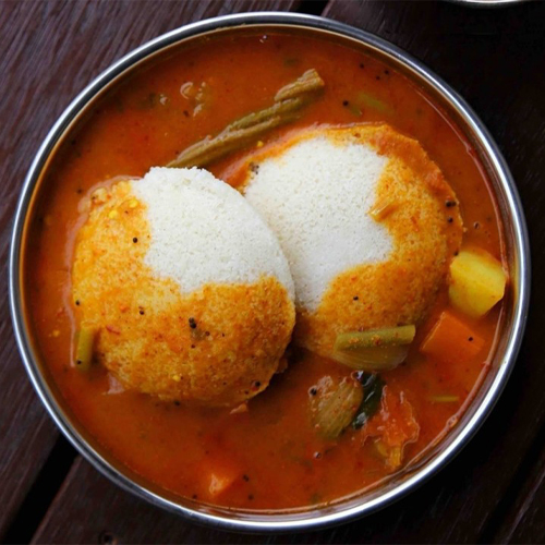 Steamed Rice Cakes Served With Variety Of Chutneys And Sambar
